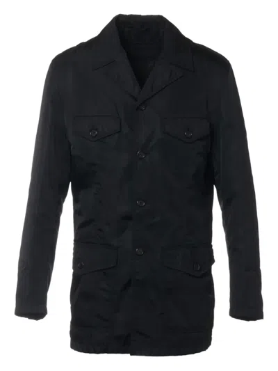circa 1990 black front button fastening decorative stitching notched lapels long sleeves four front flap pockets central rear vent Condition: GOOD. This previously owned and used item is in good condition with minimal signs of use. This may include fading of material or plating and scratches.