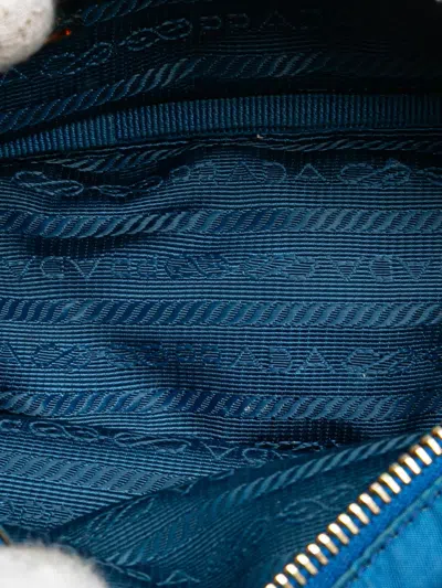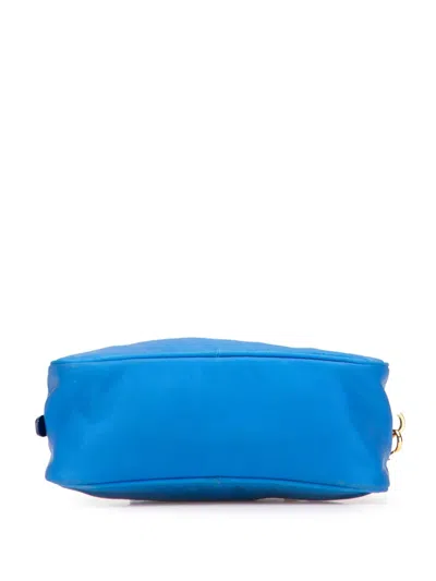 This pouch features a nylon body, a flat leather wrist strap, a top zip closure, and an interior zip pocket. Blue. This item has no inclusions. Condition: GOOD. This previously owned and used item is in good condition with minimal signs of use. This may include fading of material or plating and scratches. Please refer to the photos on this product page for a detailed view of the item, including any damages declared.