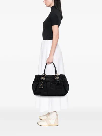 gathered nylon body rolled leather handles open top with magnetic snap closure interior zip and slip pockets black Inclusions: charm. Condition: GOOD. This previously owned and used item is in good condition with minimal signs of use. This may include fading of material or plating and scratches. Declared Damages: Exterior Bottom Feature(s) Minor Loose Stitching. Please refer to the photos on this product page for a detailed view of the item, including any damages declared.