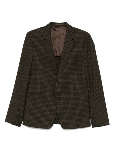 circa 2010s taupe brown wool blend check pattern front button fastening notched lapels dart detailing two front patch pockets long sleeves buttoned cuffs English rear vents