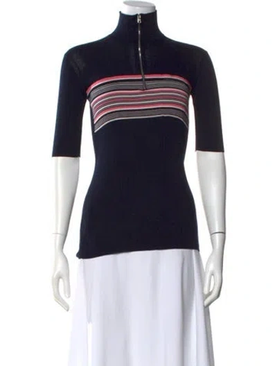 Prada Silk Top From the 2018 Collection by Miuccia Prada Blue Striped Three-Quarter Sleeve with Mock Neck Exposed Zip Closure at Front Designer Fit: Designed for a slim fit, those with a curvy figure may wish to take one size up. | Prada 2018 Silk Top in Blue, Women's US2, IT38 | XS