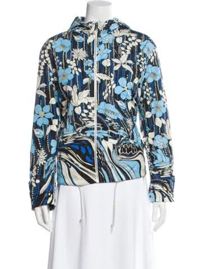 Prada Nylon Jacket From the Resort 2019 Collection by Miuccia Prada Blue Floral Print With Hood Pointed Collar Slit Pockets & Zip Closure Designer Fit: Designed for a slim fit, those with a curvy figure may wish to take one size up. | Prada 2019 Nylon Jacket in Blue, Women's US4, IT40 | S