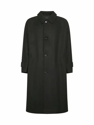•Front button placket •Shirt collar •Long raglan sleeves, buttoned belted cuffs •Fabric triangle logo and tailoring label at nape •Side welt pockets •Central slit at bottom back •Lined •Regular fit •Green color •100% Virgin Wool •Made in Italy