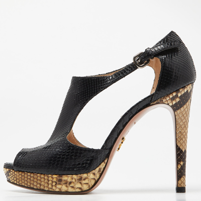Pre-owned Black Python Leather Peep Toe Platform Ankle Strap Pumps Size 37.5