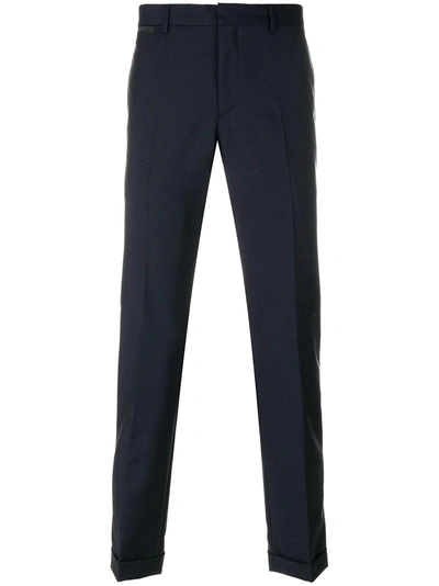 Confident yet considered, iconic Italian fashion house Prada balances uncompromised quality with experimental, season-defining styles. Blue wool slim tailored trousers featuring a mid rise, a regular length and two back buttoned welt pockets.