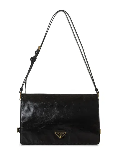 •Foldover-top with magnetic fastening; enameled metal triangle logo at flap•Adjustable leather shoulder strap•Interior: two main compartments, central pocket, logoed nylon lining; exterior: zip pocket at back•Adjustable side leather straps with metal buckles•Gold-toned metal hardware•Mirrored-finish leather design•30 X 18.5 X 9cm; shoulder strap drop: 30cm•Black color•100% Calf Leather•Made in Italy
