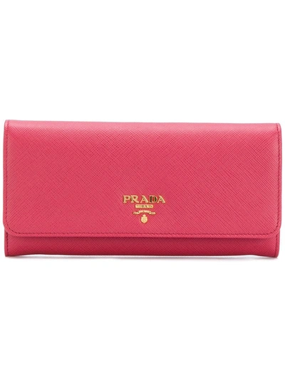 Founded by Mario Prada, the brand is known for producing timeless items with traditional Milanese construction. Expect to see outerwear with a utilitarian twist and vibrant accessories that have amassed a cult following. Pink leather classic continental purse featuring a fold over top with snap closure, a logo plaque, multiple interior card slots and an interior zipped compartment.