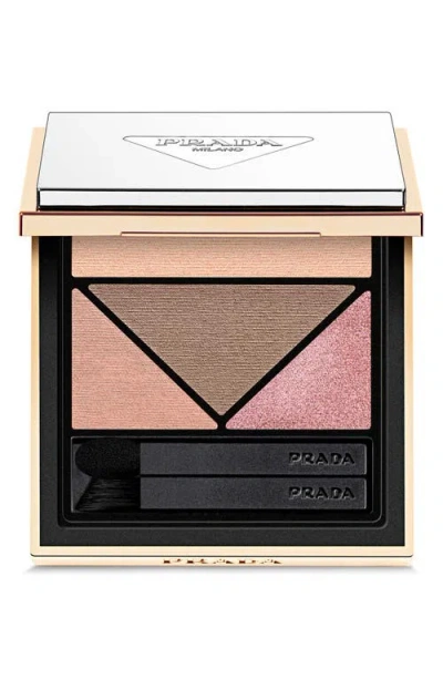 What it is: A refillable eyesight palette with a combination of three sophisticated neutrals and a single eccentric accent shade in four dynamic finishes. What it does: The refillable eyeshadow palette is created using a low-pressure injection process with Micro-Pixel pigments, which deliver one-stroke color payoff with high color resolution. The hybrid creamy-powder finish eyeshadows blend without fallout. Their skin affinity provides weightless comfort and 12 hours of durable, longlasting wear. Infused with plukenetia volubillis oil, Prada Dimensions offers a seamless glide-on application and gives eyelids a smoother look after 28 days of daily use. A true invitation to explore all of your dimensions and to experiment with endless combinations of easy-to-wear, easy-to-dare eye looks with maximal color expression. The refill allows for 75% less packaging use when compared to repurchasing a full eyeshadow palette. How to use: Push the triangle on the back of the eyeshadow palette to eject the refill. Peel off the protective paper from the adhesive tape on the back of the new refill. Seal the new refill in your Prada palette by pressing down gently. Made in France