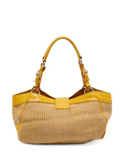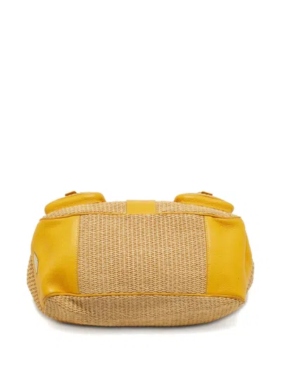 yellow raffia construction leather accents front pockets top handle silver-tone hardware Condition: GOOD. This previously owned and used item is in good condition with minimal signs of use. This may include fading of material or plating and scratches.