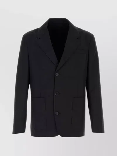 Single-breasted, wool blend blazer with lightweight construction with front three-button closure, mirror lapels, patch pockets, chest pocket, long sleeves, lining, tone-on-tone fabric triangle and back split. Colour: Black Composition: 64% virgin wool, 36% polyamide Country Of Manufacture: Italy Dimension: true to size fit MPN: UGM334SOOO13L5F0002