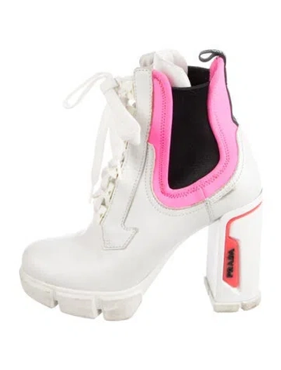Prada Leather Mules Pink & White Colorblock Pattern Round-Toes Platform Lace-Up Closure at Uppers Designer Fit: Pumps by Prada typically run a half size small. Unfortunately, due to restrictions, this item may not be eligible for shipping in all areas. | Prada Leather Colorblock Pattern Mules in Pink/White, Women's IT 35 | 5