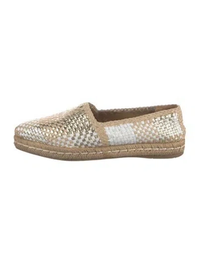 Prada Leather Espadrilles Gold & Neutrals Patterned Jute Trim Semi-Pointed Toes Platform Includes Dust Bag Size not listed, estimated from measurements. Designer Fit: Flats by Prada typically run a half size small. Unfortunately, due to restrictions, this item may not be eligible for shipping in all areas. | Prada Leather Patterned Espadrilles in Gold/Neutrals, Women's 10.5