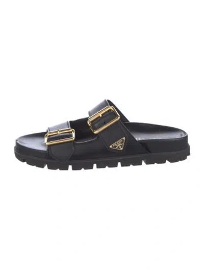 Prada Leather Slides Black Designer Fit: Sandals by Prada typically run a half size small. Unfortunately, due to restrictions, this item may not be eligible for shipping in all areas. | Prada Leather Slides in Black, Women's IT 39 | 9