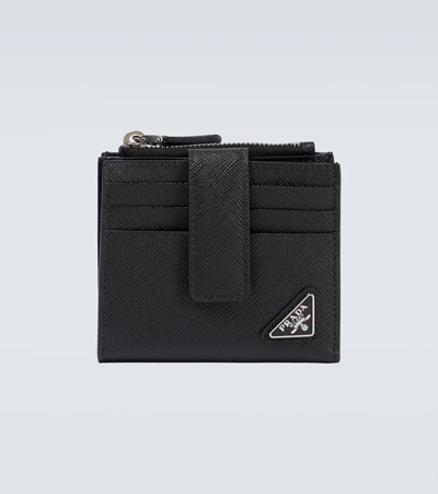 Made in Italy, this Prada wallet is cut from textured black leather and features numerous card slots, a zipped pocket, and a triangle enamel logo.
