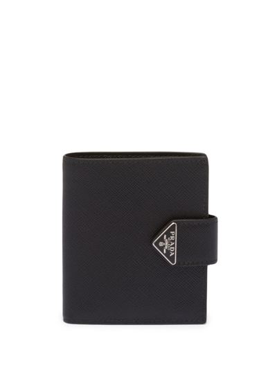 saffiano logo-plaque wallet from PRADA featuring Saffiano leather, logo plaque, foldover top with press-stud fastening, internal card slots, internal note compartments, black and leather.