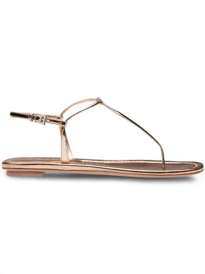 Established in 1913 by Mario Prada, the eponymous brand is renowned for fashioning timeless items with traditional Milanese craftsmanship at its helm. These gold-toned leather sandals feature an ankle strap with a side buckle fastening, a flat sole, an open toe and a metallic sheen.