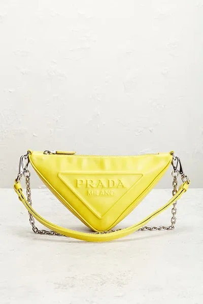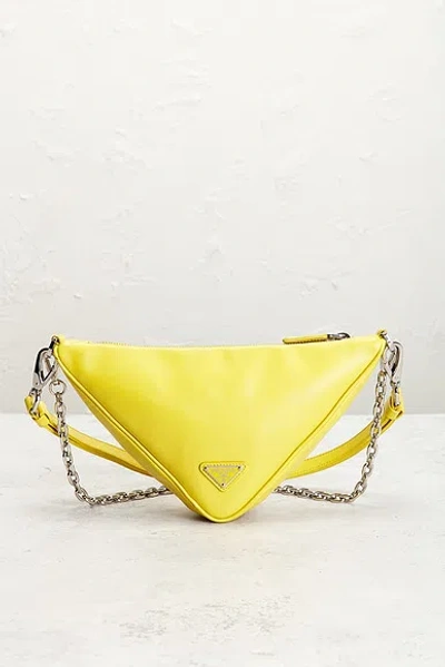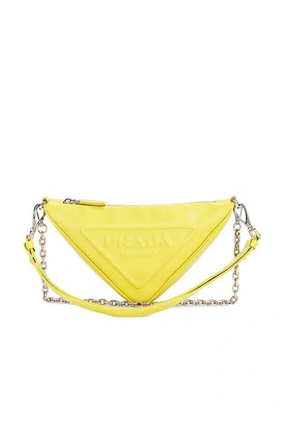 prada Prada Mini Triangle Shoulder Bag in Yellow - Yellow. Size all. Calfskin leather exterior with textile lining. Made in Italy. Top zipper closure. One main compartment. Measures approx 10.25 W x 5.5 H x 3 D Shoulder strap with a 16 drop Top handle with a 10 drop. Excellent. Very minor loss of shape. Light scratching to exterior hardware. Original brand box, dust bag, authenticity card, and hangtags not included. FNEF-WY7383. 12682170. About the designer: