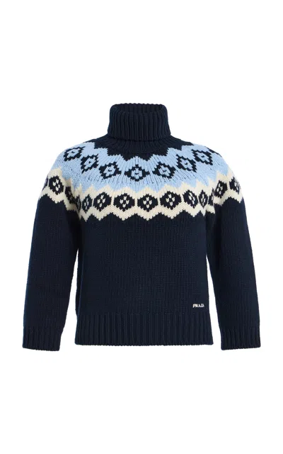 Miuccia Prada and Raf Simons reimagine hyper-feminine wardrobe motifs to create a fresh; sophisticated; and endlessly cool wardrobe for today and tomorrow.Made with a premium blend of wool and cashmere; this sweater reinterprets après-ski style with an intarsia-knit fair isle pattern. It has a boxy fit; mock neck and three-quarter sleeves.