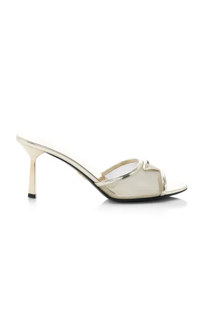 Miuccia Prada and Raf Simons reimagine the brand's archival accessories to create a fresh; sophisticated and endlessly cool collection for today and tomorrow.Crafted in Italy from high-shine metallic leather; these mules feature a toe strap made from sheer mesh. The padded logo and geometric heel nod to the house's iconic triangle emblem.