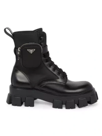 From the Monolith Collection. Sleek leather combat boots with iconic logo and rugged rubber lug soles. Leather/polyamide/nylon upper Round toe Lace-up vamp Zip pocket Back pull tab Rubber sole Made in Italy Style code : 0400013076758 NERO