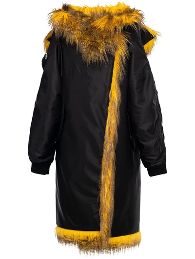 Black oversized Re-Nylon raincoat from PRADA featuring front zip-fastening pouch pocket, faux-fur lining, classic hood, off-shoulder, off-centre front fastening, long sleeves and mid-length.