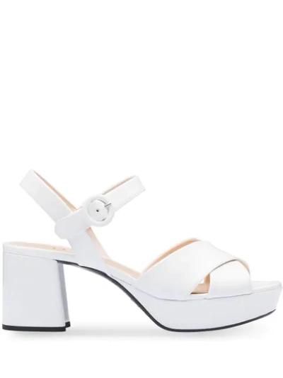 Defining luxury since 1913, Italian fashion house Prada is renowned for their uncompromised quality and timeless design vision. Made in Italy from white leather and patent leather, these retro-tinged sandals feature an open toe, crossover straps to the front, an ankle strap with a side buckle fastening, a branded insole, a platform sole and a mid high block heel.