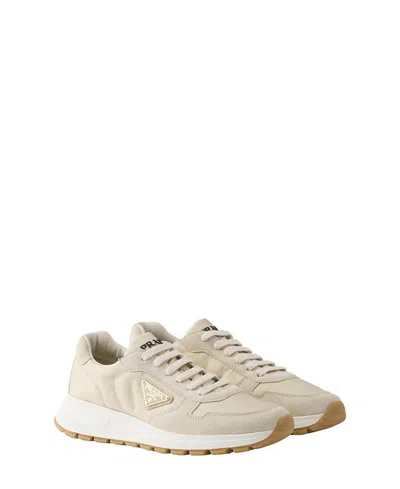 Sneakers in suede and nylon. Golden PRADA logo. Rubber sole.. Elegance and comfort converge in these PRADA sneakers, crafted from a sophisticated blend of chalk-colored suede and nylon. A distinctive touch is provided by the golden logo on the side, while the sturdy rubber sole ensures durability and grip
