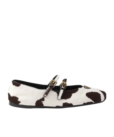 Product details These leather ballerinas with elegant feminine allure are animated by an animal print Classic lines and sophisticated details define the round toe shoes with double strap and rubber sole embellished by the enameled metal triangle logo Product code 1F794N_ASA_F0G3N_F_D005 Double straps with logo-engraved metal buckles Enameled metal triangle logo Monoblock rubber sole 5 mm with hot-stamped logo Imported Main material Calfskin