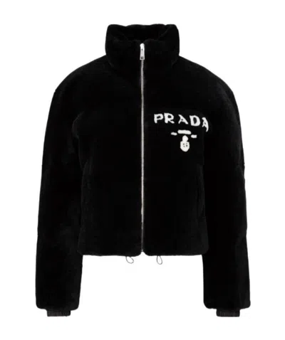 Black/white logo-print zip-fastening jacket from PRADA featuring logo print at the chest, shearling trim, funnel neck, long sleeves and front zip fastening.