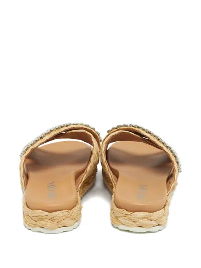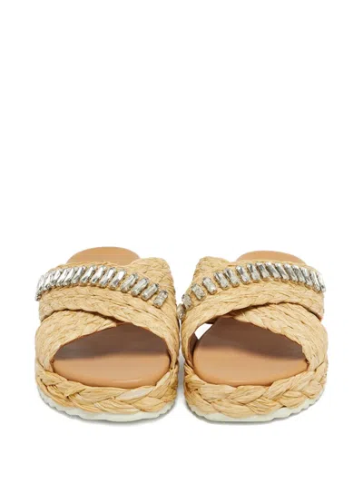 beige crystal-embellishments raffia construction platform sole interwoven strap open-toe Condition: EXCELLENT. This previously owned item is in near-perfect condition with no signs of damage or use.