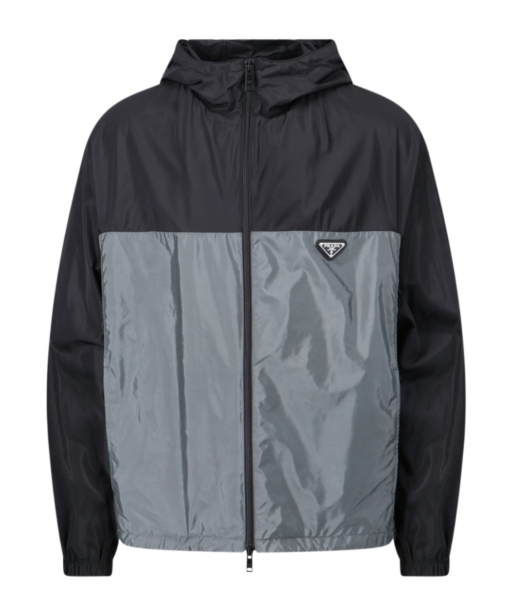 Double zip closure, enamel metal triangular logo on chest, two side welt pockets, ribbed finishes, straight hem.