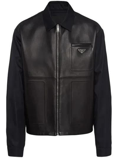 Re-Nylon leather jacket from PRADA featuring black, leather, recycled nylon, panelled design, classic collar, chest patch pocket, enamel triangle logo, front zip fastening, two side patch pockets, buttoned cuffs and straight hem.