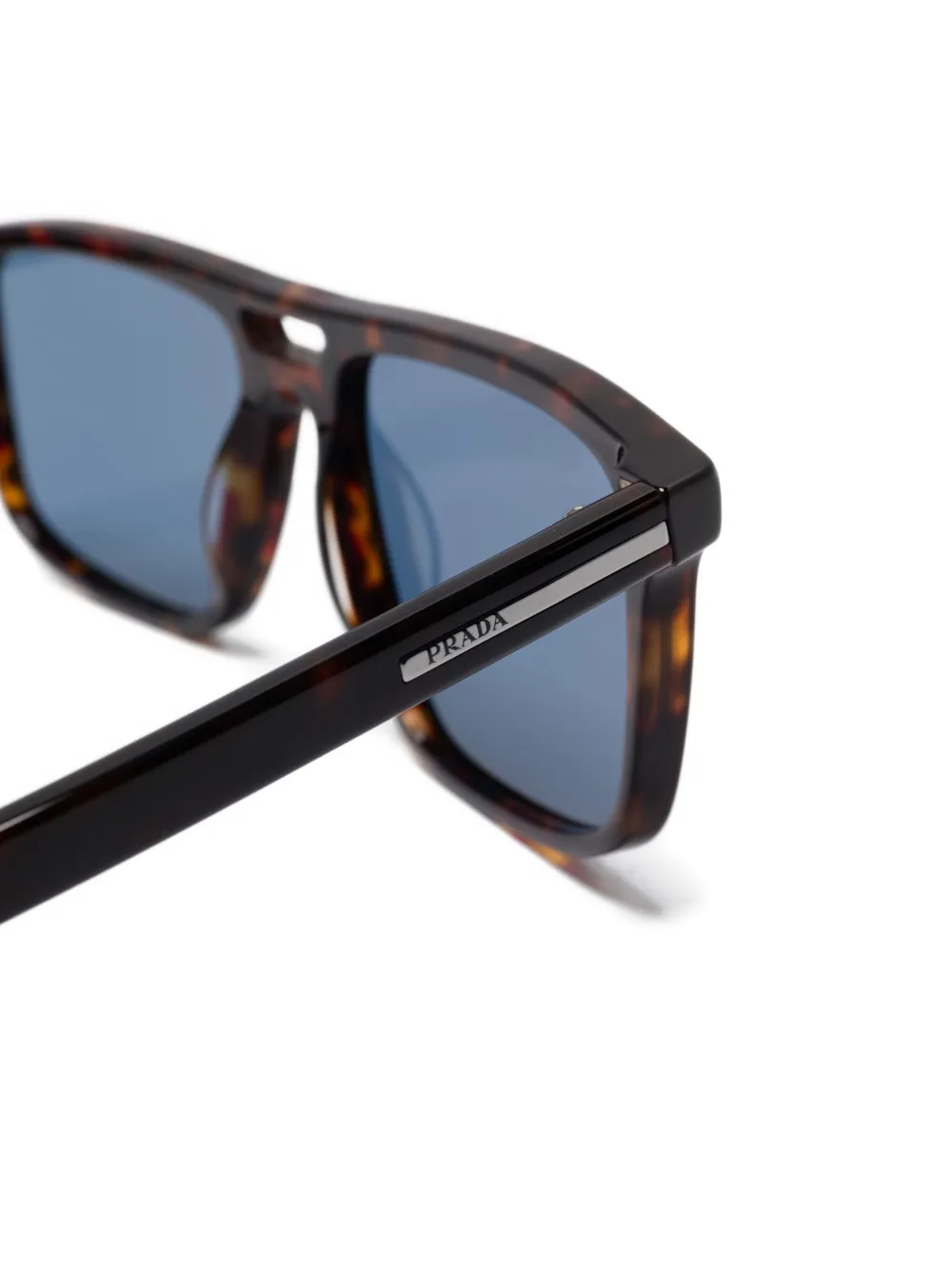 brown tortoiseshell pattern rectangle frame blue lenses silver-tone metal details These glasses come with a protective case. Condition: EXCELLENT. This previously owned item is in near-perfect condition with no signs of damage or use.