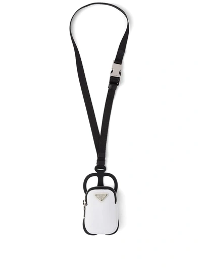 White/black re-nylon smartphone case from PRADA featuring two-tone design, enamel triangle logo, adjustable neck strap, top zip fastening and silver-tone hardware.