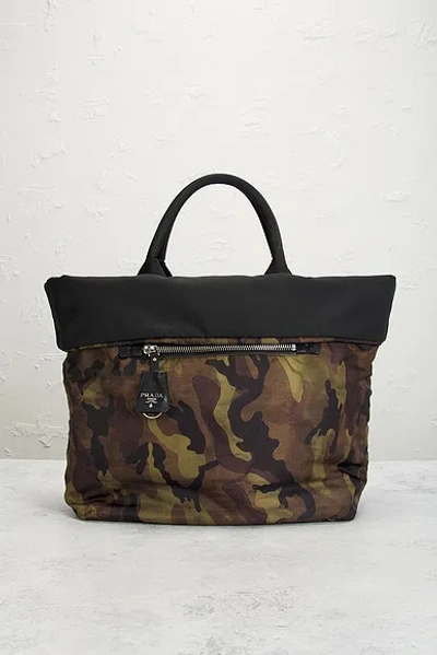 prada Prada Reversible Camouflage Handbag in Multi - Black,Green. Size all. Green nylon exterior and nylon with silver-tone hardware. Made in Italy. Open top. One main compartment. 1 interior zip pocket. 1 exterior zip pocket. Original brand dustbag, authenticity card, key ring clochette, mini envelope, description card, and care booklet included. Measures approx 14 W x 13 H x 6.5 D Top handle with a 6 drop. Good. Light marks throughout. Light wear throughout. Light scratches on hardware. Original brand box and hang tag not included. FNEF-WY7619. 12850370. About the designer: