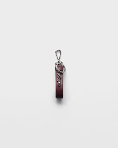 With snap-hook and ring Removable enameled metal triangle logo on the front Metal lettering logo on the back The keychain can be customized at Prada stores