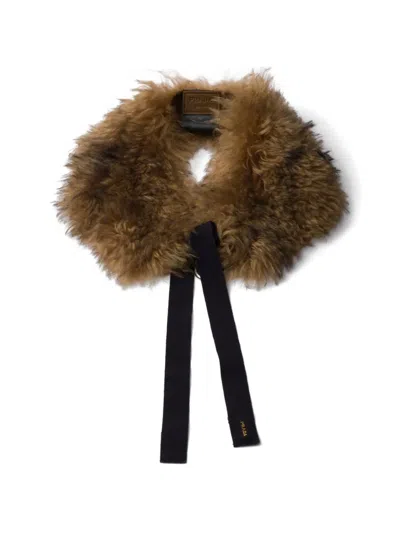 Updated with contemporary touches and signature brand details. Crafted in shearling, this collar is finished with a grosgrain ribbon accent. lined metal logo on grosgrain