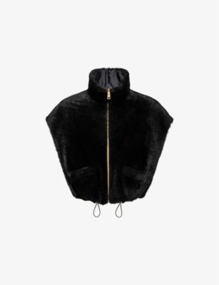 black shearling enamel triangle logo reversible logo-engraved gold-tone hardware stand-up collar front zip fastening sleeveless two side patch pockets drawstring hem cropped