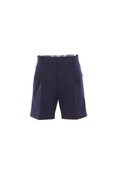 Prada chino shorts crafted from navy blue cotton gabardine. Featuring a front closure with hook/zip, belt loops, front pleats, multiple pockets, and a central pressed crease.