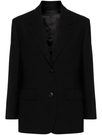 black virgin wool textured finish enamel triangle logo dart detailing notched lapels front button fastening shoulder pads long sleeves with buttoned cuffs two front flap pockets multiple internal jetted pockets American rear vent curved hem full lining