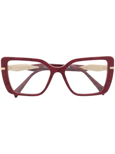 square frame glasses from PRADA EYEWEAR featuring bordeaux red, acetate, clear lenses, square frame, logo plaque at the arm, straight arms and curved tips. All glasses from FARFETCH are sold as non-prescription frames.. These glasses come with a protective case..