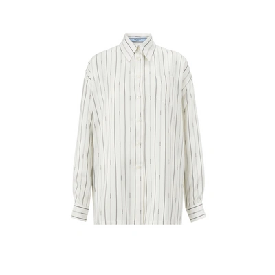 striped long-sleeve shirt from PRADA featuring white, silk, stripe print, classic collar, front button fastening, long sleeves and straight hem.