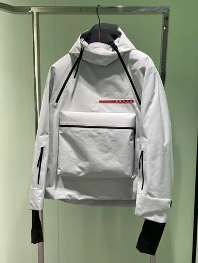 This chalk white charge suit is made of technology fabric and decorated with the iconic latex rubber logo. The fabric is made of three layers of bonded polyester fiber with high waterproof and wind-proof properties and excellent air permeability. Item number: SGB799_1CAH_F0K74_S_202 LR-HX036 Three layers of bonded polyester fabric with a central layer that ensures high waterproof and windproof properties and excellent air permeability Conventional version Upright collar with hidden hood Straight cut sleeve Wax zipper zipper Waxed zipper pleated pocket Cuff with Velcro buckle Conventional shoulder Back round hem Elastic bundle rope Lined with graphene staple fiber Heat sealing tape seams Latex rubber label Decorative ribbons for side and sleeve seams Height: 75cm