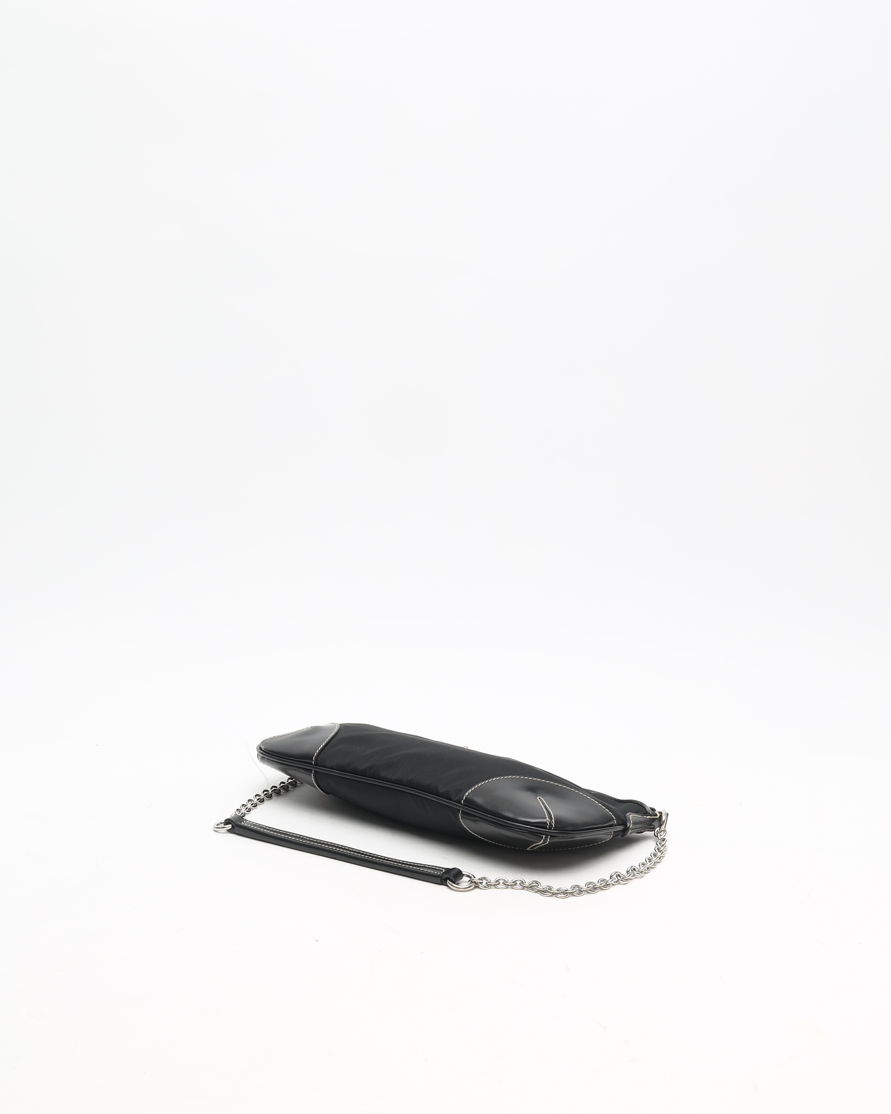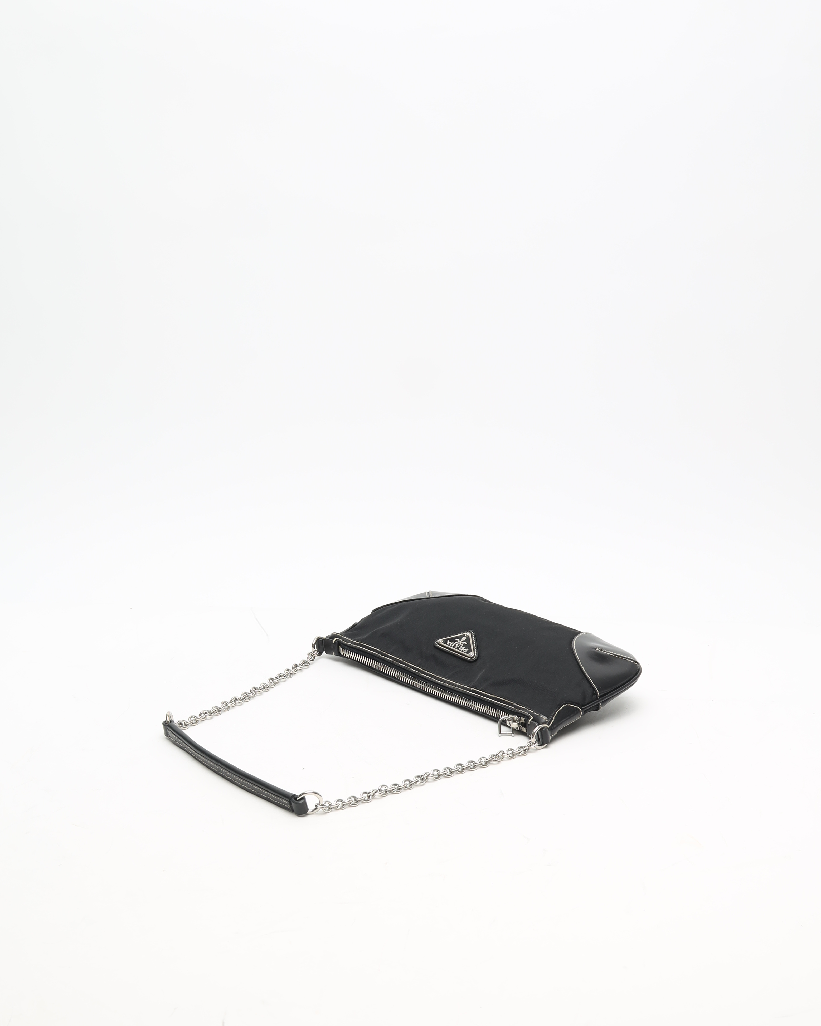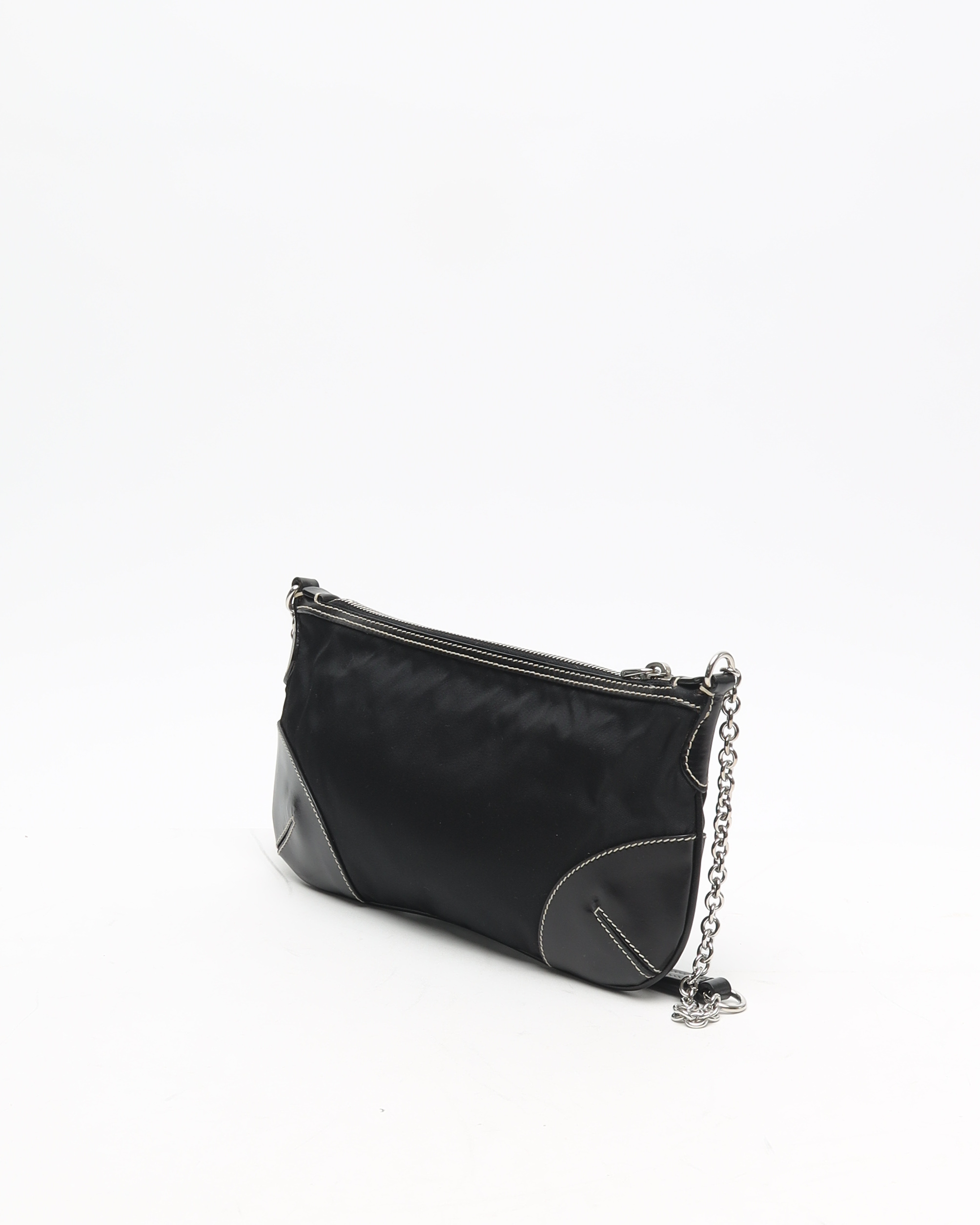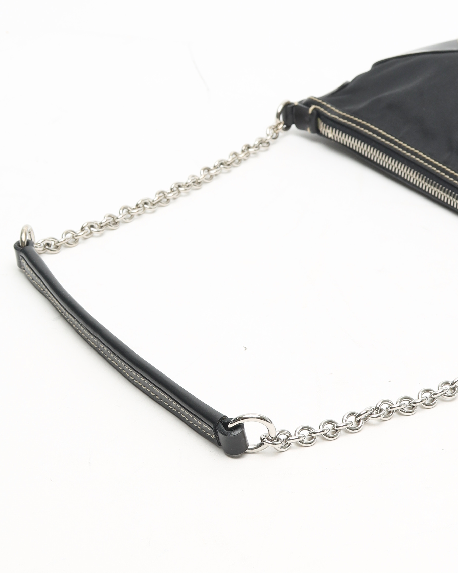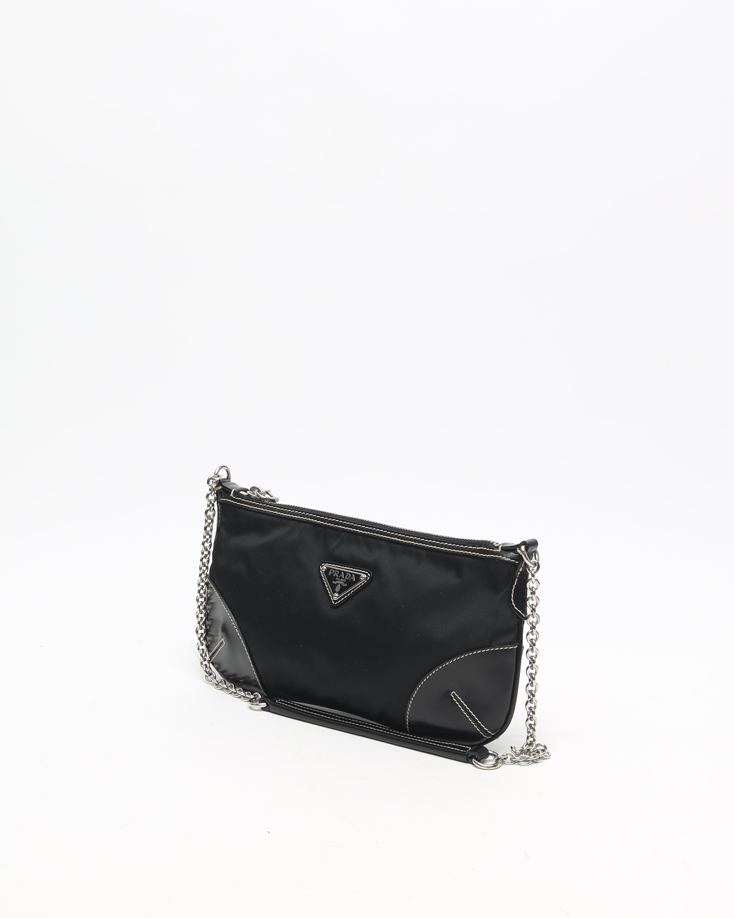 Prada Tessuto Chain Bag- Silver-tone hardware - Black cloth lining- Chainlink shoulder strap with leather detail- Black jacquard lining with one pocket- VintageOverall Preloved Condition: Very Good.Exterior Condition: Very Good. Light trace of use. Missing zipper leather detail.Interior Condition: Very Good. Light trace of use.Hardware: Shiny with scratches.Delivered with dust bagMade in ItalyDimensions:Height 13 cmWidth 21 cmDepth 1 cmHandle drop 21 cmPlease note that the majority of our items are vintage and therefore have tales to tell unless stated otherwise. Therefore, please look at pictures, descriptions and measurements provided as they give you the best idea of the story this item has to tell.* Please note that when you buy a vintage product, the dimensions may vary slightly from a new one depending on previous care and storage.