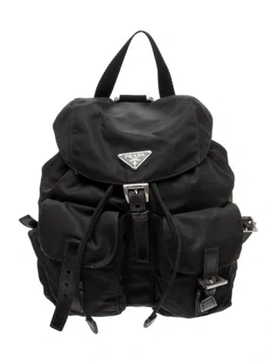 Prada Backpack Nero Tessuto Tessuto Nylon & Enameled Metal Triangle Silver-Tone Hardware Leather Trim Flat Handle & Dual Adjustable Shoulder Straps Leather Trim Embellishment & Dual Exterior Pockets Logo Jacquard Lining & Single Interior Pocket Snap & Buckle Closures at Front, Drawstring Closure at Top | Prada Tessuto Nylon Backpack in Black