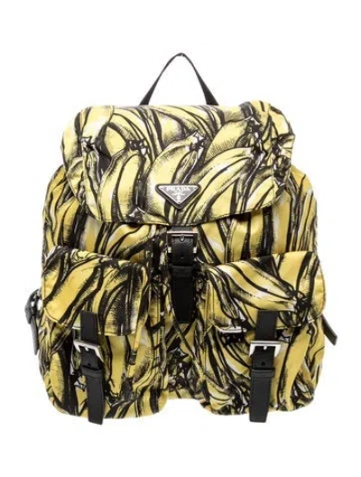 Prada Backpack Yellow Tessuto Printed Tessuto Nylon & Enameled Metal Triangle Multitonal Hardware Saffiano Leather Trim Flat Handle & Dual Adjustable Shoulder Straps Dual Exterior Pockets Logo Jacquard Lining & Dual Interior Pockets Drawstring Closure at Top & Pull-Through Closure at Front | Prada Tessuto Nylon Backpack in Yellow