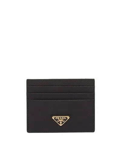 Calfskin card holder by prada, card slots on front and back, iconic triangular brand logo plaque applied on front, grained leather design. Composition: 100% % Calf Leather Bos Taurus