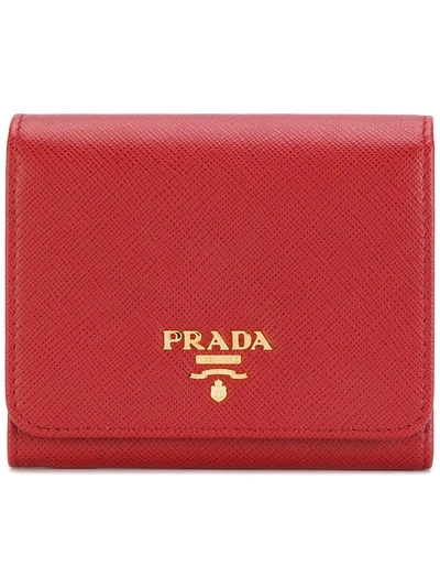 Red leather trifold wallet from Prada featuring a saffiano leather finish, a gold tone logo and a snap button closure.