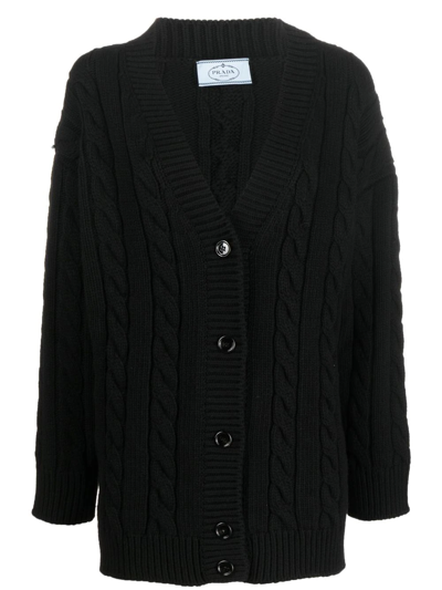 Made from a blend of virgin wool and cashmere, this cardigan from Prada is defined by its textured cable-knit construction. It is designed with drop shoulders for a relaxed feel. Highlightsblack virgin wool-cashmere blend cable knit V-neck drop shoulder front button fastening long sleeves ribbed-knit edgeMade in Italy. Composition Virgin Wool 70%, Cashmere 30% Gender: Women*Import tax/duty will be calculated at checkout (If applicable)