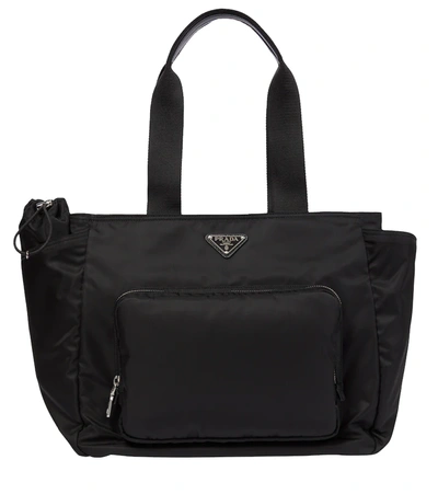 Woven nylon handles---Detachable adjustable 100 cm logo-print woven nylon shoulder strap---Zipper pocket on the front and mat inside---Open side pockets, back zipper pocket---Metal hardware---Enameled metal triangle logo on the front---Zipper closure---Re-Nylon logo-print lining with three pockets, including one with zipper---With feet